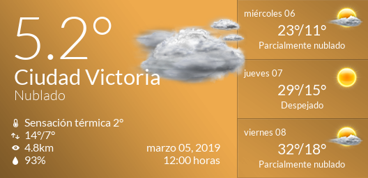 Visualiza el pronóstico actualizado del tiempo mapas noticias y alertas todo en Yahoo Clima. Consiga su previsión del tiempo de 3 días para Ciudad Victoria Tamaulipas México. Clima en Ciudad Victoria 8 - 14 días.